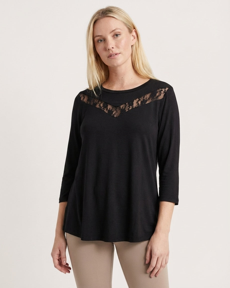 • The Lace Inset Top distinguishes itself with a perfect blend of comfort and style, combining seamless stretch fabric with intricate lace detailing for a unique and elegant look.
