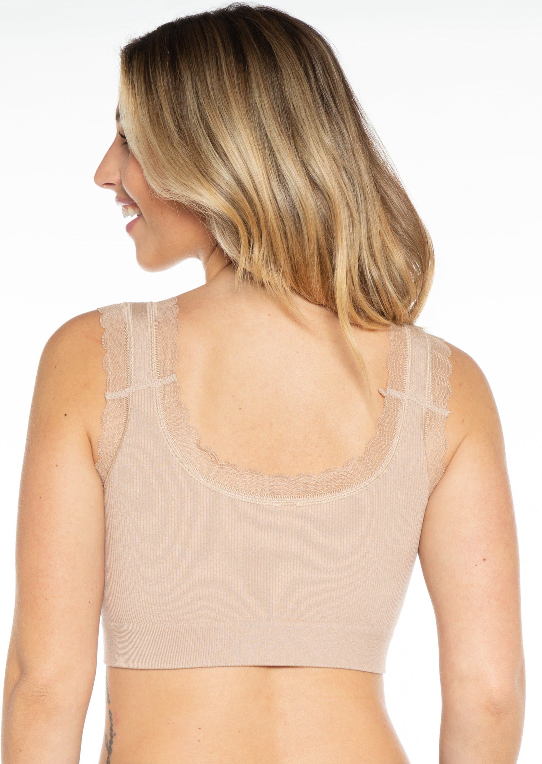 Wire free design features soft and smoothing 4-way stretch seamless fabrication that is easy to size. Gentle knit-in support makes this the bra you forget you are wearing. Step in or pullover style. No hooks, no wires, no tags.