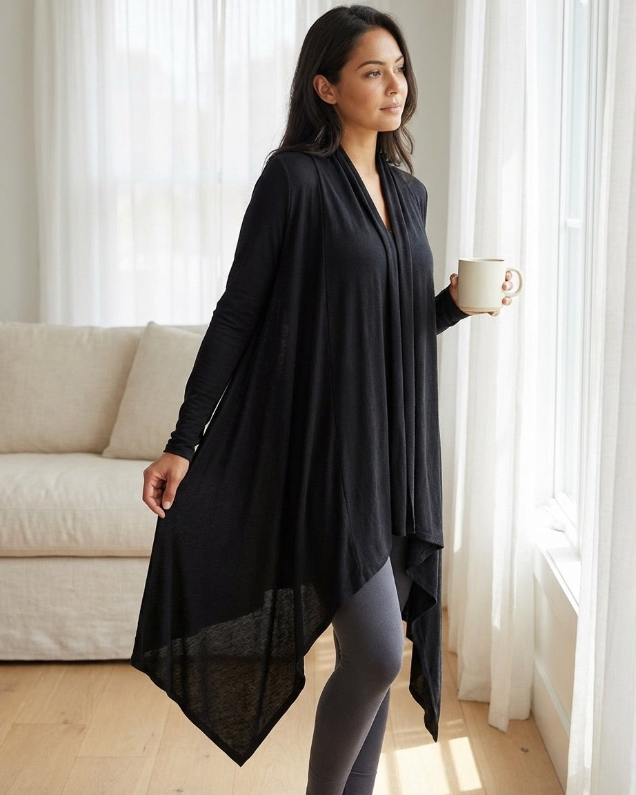 The Sexy Snuggle Knit Shrug gives you arm coverage without any bulk in the front with its unique long sleeve styling with full coverage back. Wear it long sleeve or push it up your arm for more of a draping effect. Truly a one of a kind lightweight lounge wrap. Excellent style for travel!